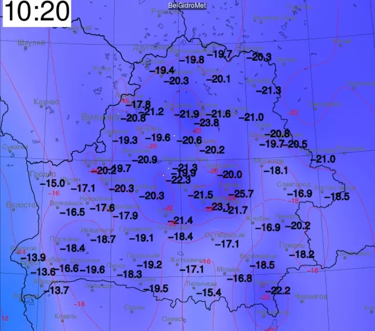 Менавіта столькі было ў ваколіцах Бабруйска. У Мінску апускалася да 23 градусаў. Прычым цяпер а 10‑й раніцы ў сталіцы мінус 21,8°С.