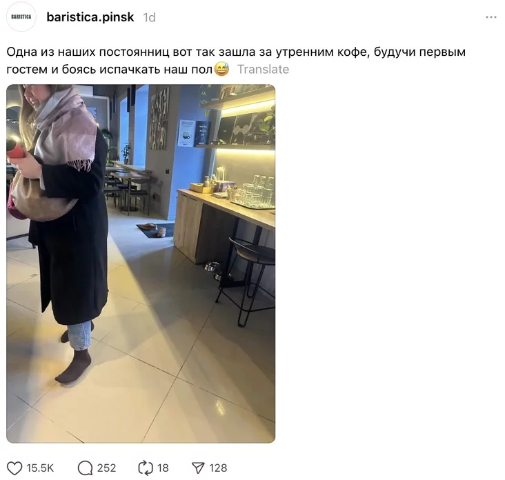 «Адна з нашых пастаянніц вось так зайшла па ранішнюю каву, будучы першым госцем і баючыся выпацкаць нашу падлогу», — напісала кавярня.