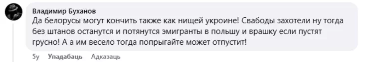 - Пра пратэстоўцаў: «Дык беларусы могуць кончыць гэтак жа, як жабрацкая Украіна! Свабоды захацелі, ну тады без штаноў застаняцеся, і пацягнуцца эмігранты ў Польшчу і ў Рашку, калі пусцяць, сумна! А ім весела, тады паскачыце, можа, адпусціць!»