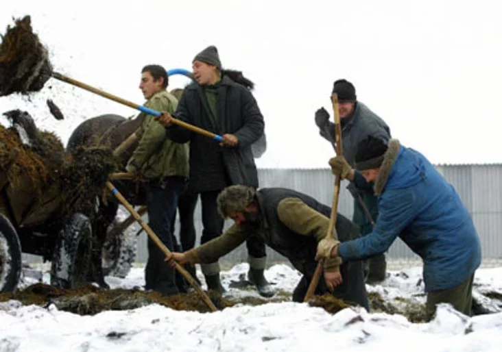 Традыцыі і сучаснасьць. Скотнікі калгасу «Беларусь» грузяць сілас. Чэрвеньскі раён.