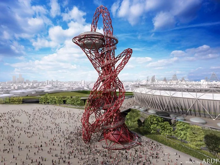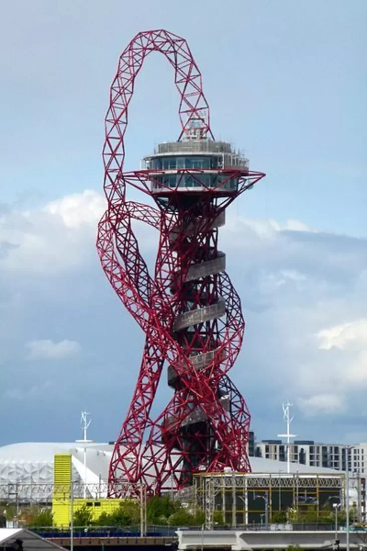 Дзіўнае чырвонае збудаванне, заўважнае на шматлікіх фотаздымках побач з галоўным стадыёнам гульняў, — гэта аглядная вежа Orbit, будаўніцтва якой было прафінансаванае металургічным гігантам ArcelotMittal і якая адразу зрабілася галоўнай мішэнню архітэктурных крытыкаў.