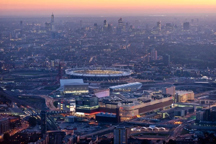 А для гледачоў Алімпіяды па суседстве з вакзалам пабудавалі буйны гандлёвы цэнтр Westfield Stratford City агульнай плошчай 175 тыс. кв.м з 300 крамамі, у тым ліку 3 буйных універмагі, 70 рэстаранаў, кінатэатр, боўлінг і казіно. На фота гандлёвы цэнтр на пярэднім плане. Заадно можна ацаніць адлегласць, якая аддзяляе Алімпійскі парк ад дзелавога цэнтра Лондана. Удалечыні бачны і тады яшчэ будаваны хмарачос The Shard, і знакаміты «агурок» Нормана Фостэра.