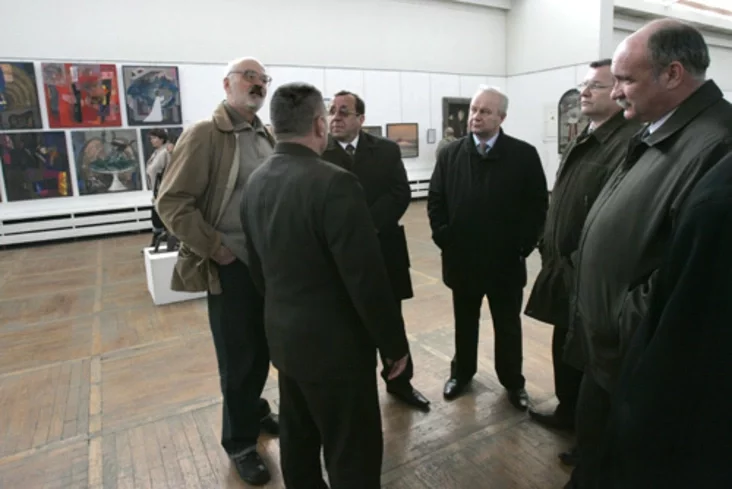 Групу чыноўнікаў на выставе творчай суполкі «Пагоні», што адкрылася ўчора ў Палацы мастацтва, чакалі з самога ранку. Пайшлі чуткі, што цэнзараваць карціны апальных мастакоў прыедзе сам мэр гораду Міхаіл Паўлаў. Дэлегацыя зьявілася па абедзе, без мэра, але на чале зь міністрам культуры Матвейчуком.