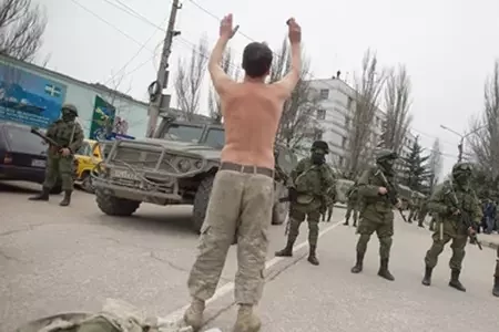 Жыхар Крыма адчайна спрабуе спыніць расійскіх вайскоўцаў ФОТА6