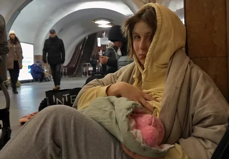 Мадонна з Кіеўскага метро. Таццяна Блізнюк з дачкой Марычкай хаваюцца ад бомб. Карціна, напісаная з гэтай фатаграфіі, стала іконай у храме італьянскага Неапаля. 26 лютага 2022 г. Фота: Андраш Фельдэш, Teleks