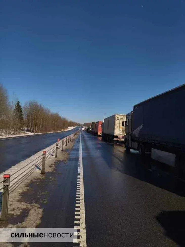 У рэдакцыю гомельскага выдання «Моцныя навіны» чытачы даслалі фота чаргі грузавікоў на беларуска-расійскім пункце пропуску. Па словах аднаго з кіроўцаў, на п.п. «Красная Горка» чарга дасягнула 25 кіламетраў, а ў чаканні даводзіцца праводзіць па двое сутак.