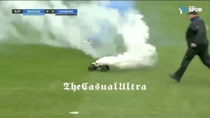 17/02/2024 Germany Hansa Rostock ultras with remote controlled mini car with smoke bomb on pitch to protest against DFL investors pic.twitter.com/RDxiQtX1KT