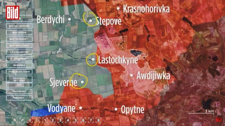 УСУ трымаюць абарону ў вёсках на захад ад Аўдзееўкі. Пасля ўзяцця Аўдзееўкі расейскія камандзіры «ап'яненыя перамогай» і імкнуцца наступаць далей на захад, каб дайсці да адміністрацыйных межаў Данецкай вобласці, піша аналітык Bild Юліян Ропке.