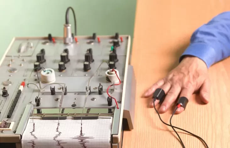 Далей на яго надзелі тры драты: на ўказальны, сярэдні і безыменны пальцы правай рукі, а таксама на вялікі палец левай. Ля печані мужчыны і трохі ніжэй за ключыцу памясцілі датчыкі для адсочвання дыхання. І пачалі з пробных тэстаў: задалі некалькі простых пытанняў і папрасілі наўмысна схлусіць пры адным з адказаў.