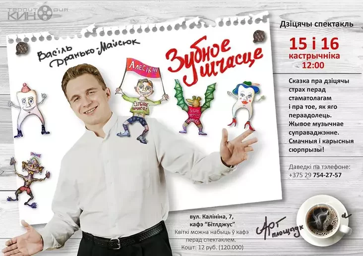 Što rabić, kali na tvaje zubki napadaje strašny karyjes, a ty vielmi baišsia stamatołaha? Jak vyratavacca ad šakaładnaj rusałki i ci mahčyma, kab zub Vasil i zubinia Hanna zajmieli sapraŭdnaje ZUBNOJE ŠČAŚCIE? Niezvyčajnaja interaktyŭnaja kazka Vasila Drańko-Majsiuka dla dzietak 4+. Praciahłaść — 45 chv. Žyvaja muzyka (bałałajka — Safija Komleva).