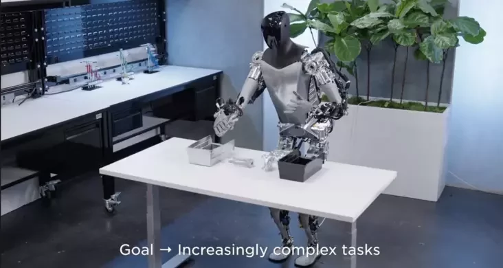 Ciapier androidy Maska Tesla Bot (ich jašče nazyvajuć Tesla Optimus) pavolna chodziać pa ofisie Tesla i daśledujuć usio navokał.