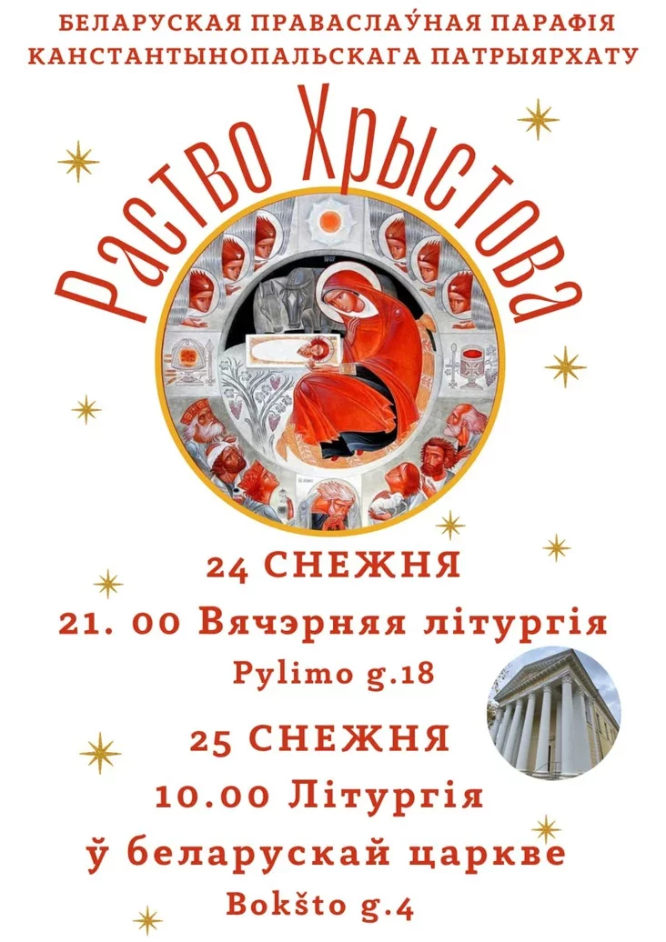 Ranicaj 25 śniežnia a 10-j hadzinie Śviatočnaja Liturhija budzie słužycca ŭ Biełaruskaj carkvie pa vulicy Bakšta (Bokšto g. 4).