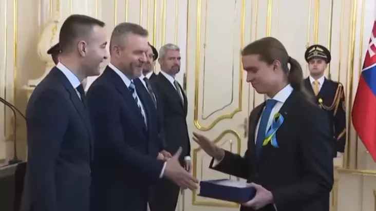 Padčas uračystaściaŭ u prezidenckim pałacy 13 studzienia słavacki staršakłaśnik Siman Omanik admoviŭsia pacisnuć ruku prezidentu krainy Pieteru Pielehryni praz prarasijskuju pazicyju apošniaha. Adbyłosia heta padčas uznaharodžańnia pieramožcaŭ matematyčnaj alimpijady. Pry hetym chłopiec mieŭ na sabie stužku ŭ kolerach ukrainskaha ściaha.
