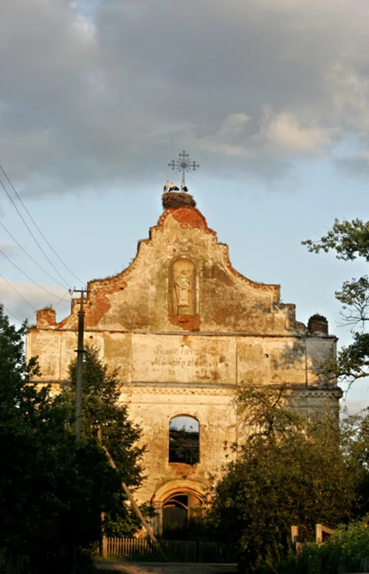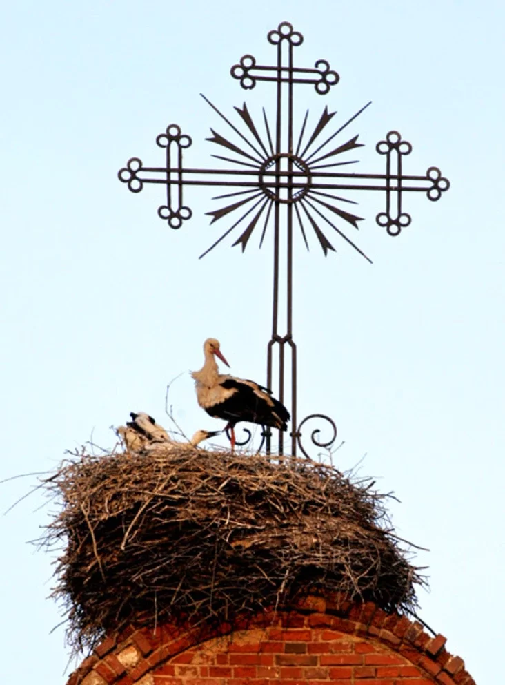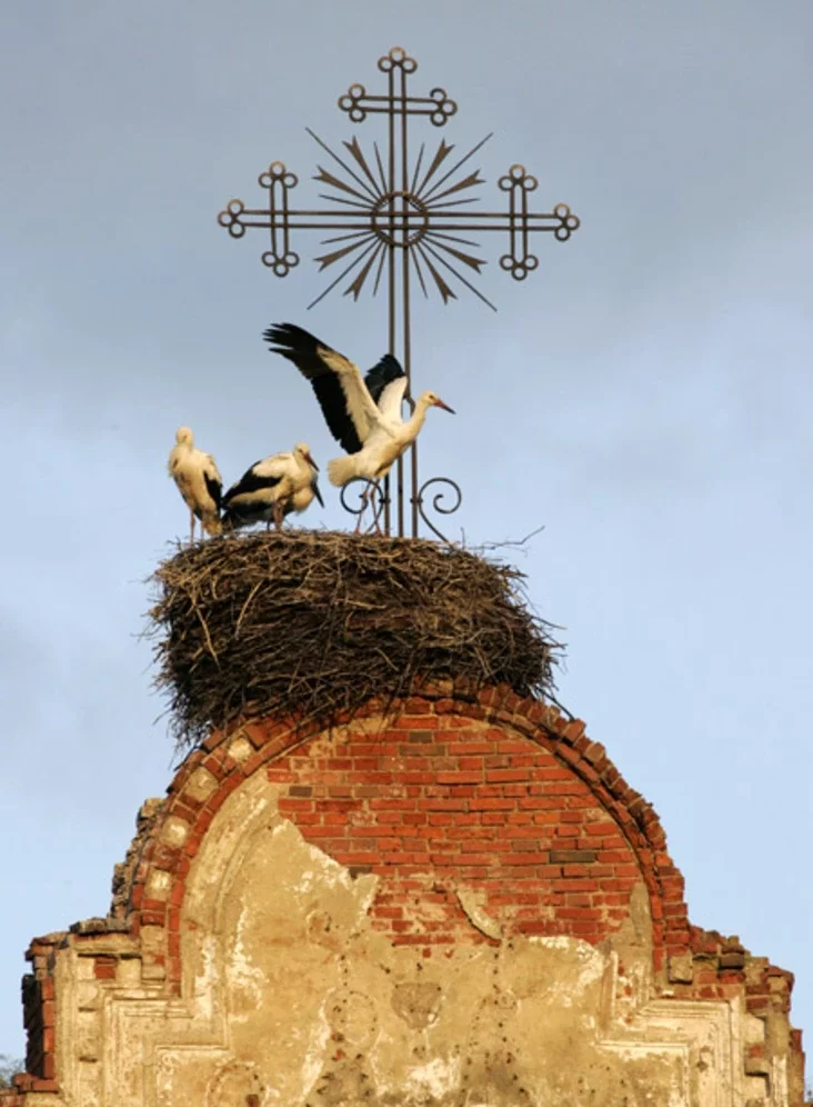 Buślinaje hniazdo ŭ Ziembinie, što ŭ Barysaŭskim rajonie, mieścicca na dachu paŭrazburanaha kaścioła XVIII st. Pieršy raz ja zdymała ptušaniat jašče ŭ traŭni.