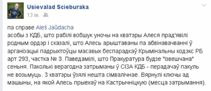 «Asoby z KDB, što rabili vobšuk unočy na kvatery Alesia pradjavili rodnym ordar i skazali, što Aleś aryštavany pa abvinavačvańni ŭarhanizacyi padrychtoŭki masavych biesparadkaŭ. Kryminalny kodeks RB art 293, častka № 3. Paviedamili, što Prakuratura budzie «paviedamlena» sieńnia. Pakolki vierahodna zatrymany ŭ SIZA KDB - pieradačaŭ pakul nie voźmuć. Z kvatery ŭziali niešta simvaličnaje. Viarnuli klučy ad mašyny, na jakoj Aleś pryjechaŭ na Kastryčnickuju (miesca zatrymańnia)».