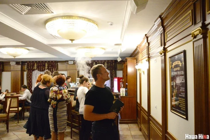 Padčas pierapynku niechta spuskajecca ŭ prybiralniu, niechta idzie da lusterka, a inšyja — u bufiet. Pasprabavać siabie ŭ kłasičnaj kinošnaj scenie «teatr-antrakt-kańjak» Michaił admaŭlajecca, bo ałkahol užyvaje tolki na vialikija śviaty. A voś padsiłkavacca jon, moža, i chacieŭ by, ale čarha ŭ bufiet i biez nas źbirajecca vialikaja. «Dyk a ŭ zale možna budzie dajeści, kali što?», — cikavicca Michaił. Kali ja tłumaču, što jano, moža, i nie zabaroniena, ale ličycca drennym tonam, bačna, što jon niezadavoleny.