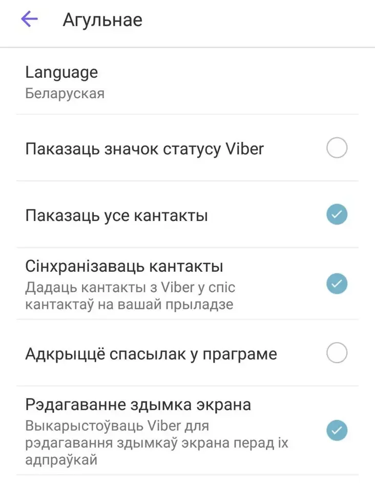 Što dla hetaha treba? Spampavać u Play Market abo Apple Store apošniuju viersiju vajbiera. Zajści ŭ «Nałady», tam abrać «Ahulnaje» i siarod prapanavanych moŭ kliknuć na biełaruskuju. Paśla hetaha ŭvieś interfejs mesandžara ŭ vas stanie biełaruskamoŭnym.