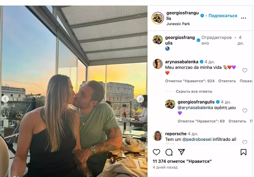 26-hadovaja biełaruskaja tenisistka Aryna Sabalenka ŭpieršyniu paćvierdziła svaje adnosiny z 35-hadovym brazilskim biznesmienam Hieorhiasam Franhulisam.