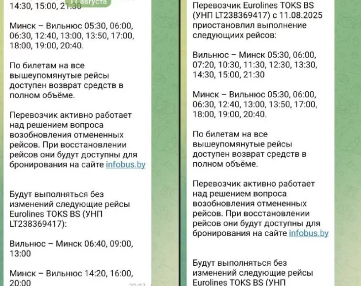 Stała viadoma, što na 12 žniŭnia bujny pieravozčyk «Jeŭrałajns» admianiŭ 20 rejsaŭ z 26 pamiž Biełaruśsiu i Litvoj. Zastalisia tolki rejsy ź Minska ŭ Vilniu na 14.20, 16.00 i 20.00, a taksama ź Vilni ŭ Minsk na 6.40, 9.00 i 13.00.
