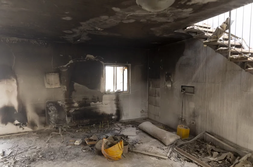 Razburany dom u Kfar-Azie ŭ vyniku napadu CHAMAS. Fota: Amir Levy / Getty Images