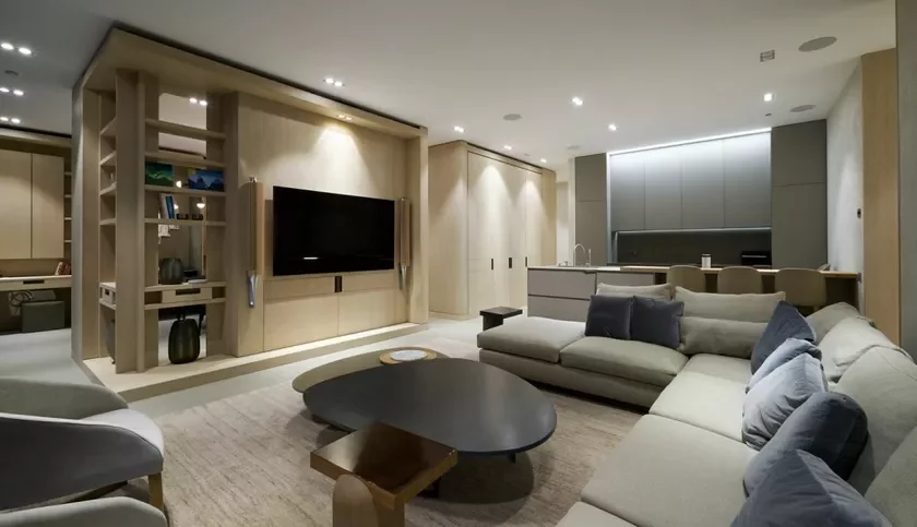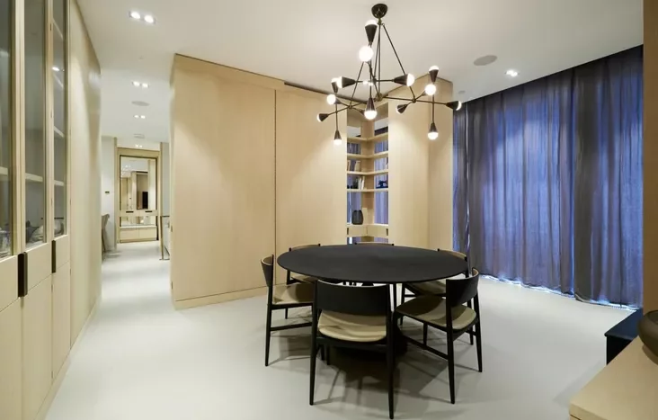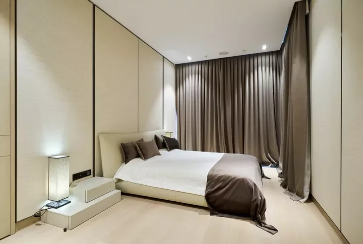 Interjer pabudavany na hulni śvietłaha dreva, miakkich tkanin i akcentnych detalaŭ: vialikija panaramnyja vokny i lohkija firanki napaŭniajuć pakoi naturalnym śviatłom.