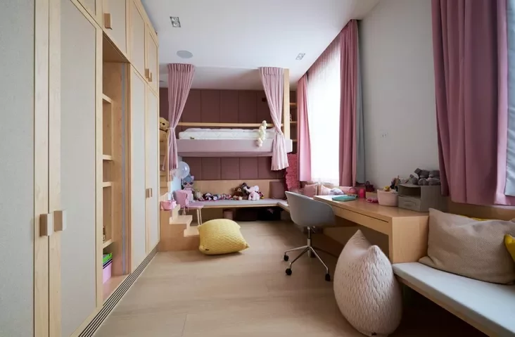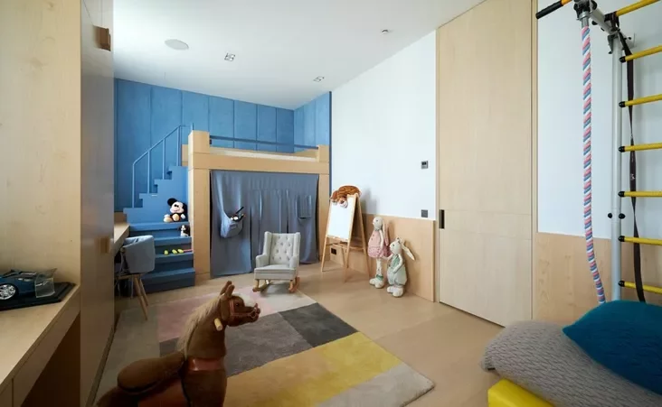U dziciačych pakojach stajać dvuchjarusnyja łožki, intehravanyja sistemy zachoŭvańnia i miescy dla hulniaŭ.
