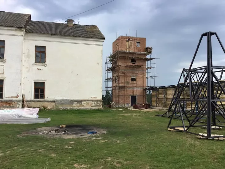 Paŭnočna-ŭschodniaja («draŭlanaja») vieža, była vymuravana z cehły na poŭnuju vyšyniu biez uzhodnienaha prajekta. Fota: telehram-kanał «Spadčyna».