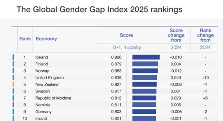 Zhodna z apošnim indeksam hiendarnaj roŭnaści Suśvietnaha ekanamičnaha forumu, kraina zajmaje pieršaje miesca ŭ Afrycy i 8‑ie ŭ śviecie z pakazčykam 80,5%. Dla paraŭnańnia: Biełaruś na 36‑m miescy (76,5%), dyj i toje dziakujučy deputatkam Pałaty pradstaŭnikoŭ, pa sutnaści pryznačanym pa hiendarnaj kvocie pa zahadzie Łukašenki.