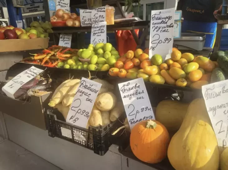 Kabački i bakłažany pradajuć pa 2‑3 rubli za kiłahram, sałodkija piercy i tamaty — ad 1,99 za kiłahram, ślivy — pa 2,9.
