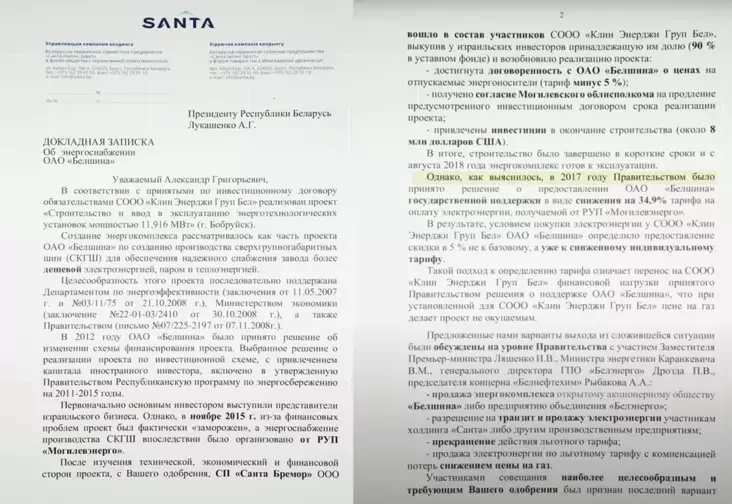 Taksama ŭ rasśledavańni pryvodzicca słužbovy list, adrasavany Łukašenku ŭ 2019 hodzie premjer-ministram Siarhiejem Rumasam i staršynioj Kamiteta dziaržkantrolu Leanidam Anfimavym. U dakumiencie paviedamlajecca, što «elektrazabieśpiačeńnie «Biełšyny» ad enierhietyčnaha kompleksu «Klin Enierdžy Hrup Bieł» pryviadzie da vypadajučych dachodaŭ elektrazabieśpiačalnych arhanizacyj sumaj blizu 7,5 młn rubloŭ na hod».