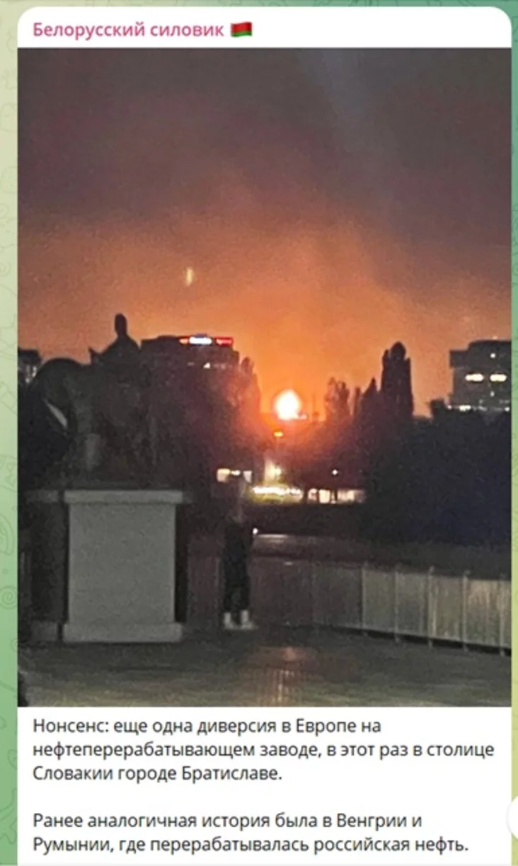 «Nonsens: jašče adna dyviersija ŭ Jeŭropie na naftapierapracoŭčym zavodzie, na hety raz u stalicy Słavakii horadzie Bracisłavie», — napisali redaktary kanała i supravadzili infarmacyju zdymkam.