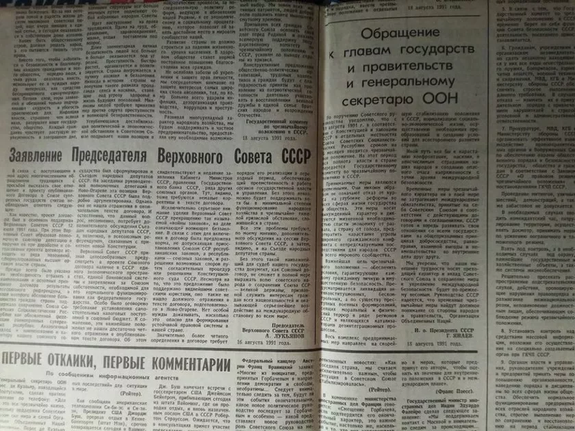 Na tarhi vystaŭleny numar savieckaj haziety «Iźviestija» ad 20 žniŭnia 1991 hoda. Tady byŭ stvorany Dziaržaŭny kamitet pa nadzvyčajnym stanoviščy (tak zvany HKČP). Hazietny numar «Iźviestij» jakraz i byŭ pryśviečany tym padziejam.