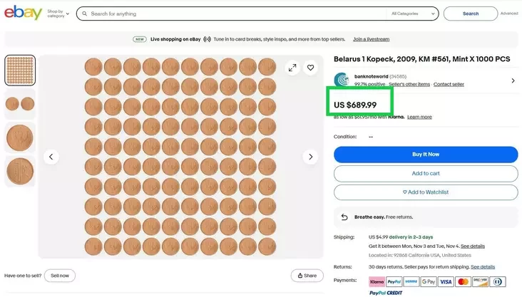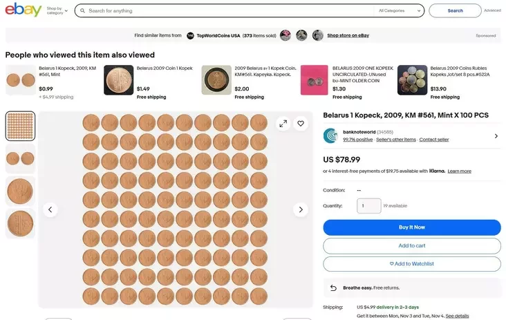 Čarhovy niezvyčajny łot ź Biełarusi na Ebay. Vydańnie MYFIN zaŭvažyła, što sotniu kapieječnych maniet sprabujuć pradać za $78. Pryčym hety ž pradaviec vystaviŭ anałahičny łot i za $689,99.