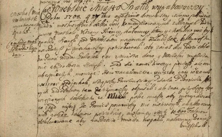 «Car [Piotr I] Viciebskaje miesta spaliŭ, razrabavaŭšy. U hodzie 1708, dnia 27 vieraśnia a dvanaccataj hadzinie, u samy poŭdzień, niekalki sot maskoŭskich ludziej, sabranych z roznych ludziej, heta značyć maskaloŭ, kazakaŭ, niemcaŭ, kałmykaŭ, jakija i Mahiloŭ užo byli spaliŭšy, stali pad Viciebskam na harach z boku Łukišak; niekalki ź ich, pryjechaŭšy na ratušu, zapatrabavali, kab adrazu dla [ichnych] ludziej chleba, piva, miodu, harełki i h.d. z horada dali, i kab hałoŭnyja miaščanie prybyli da aboza.