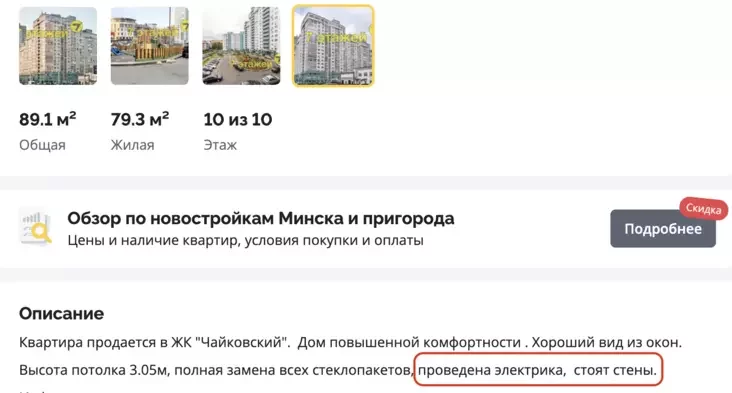 Ale jość i bolš staryja kvatery biez ramontu. ŽK «Čajkoŭski» pabudavali ŭ 2014 hodzie, ale tam dahetul jość kvatera biez ramontu, jakuju ciapier pradajuć.