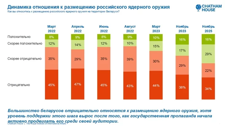 Padtrymka rašeńnia ab raźmiaščeńni jadziernaj zbroi za dva hady prykmietna vyrasła — z 33% u listapadzie 2023 hoda da 45% u listapadzie hetaha hoda, choć bolšaść — 56% — usio jašče vystupajuć suprać. Rost pakazčyka padtrymki aŭtary daśledavańnia tłumačać upłyvam dziaržaŭnaj prapahandy.