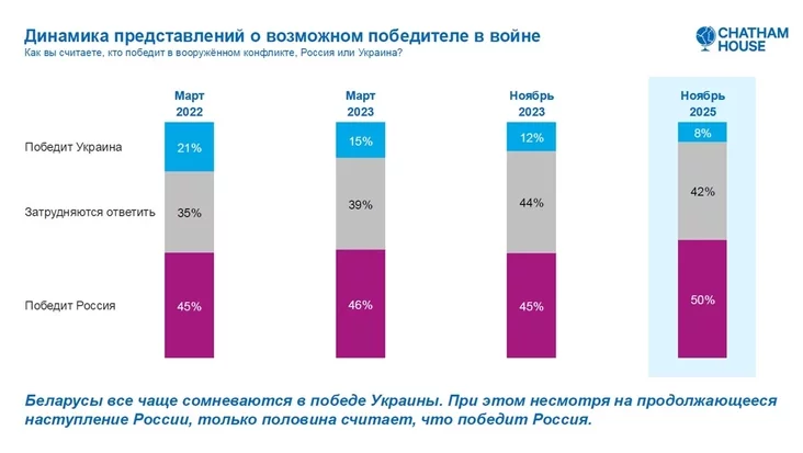Pry hetym za apošni hod biełarusy stali mienš vieryć u pieramohu Ukrainy — takich tolki 8% (hod tamu było 12%). Pra toje, što pieramoža Rasija, vykazaŭsia kožny druhi apytany. Ale i vialiki pracent tych, kamu było ciažka adkazać, — 42%.