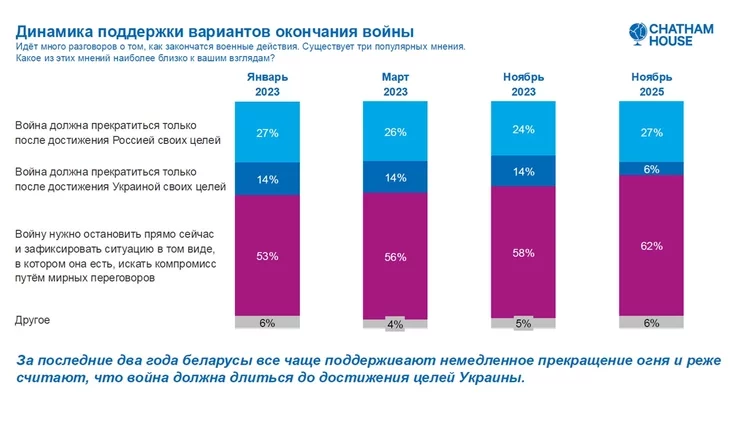 Padtrymka Rasii ŭ vajnie zastajecca adnosna nizkaj, pra jaje zajaŭlajuć tolki 27% biełaruskich haradskich žycharoŭ. Pry hetym bolšaść biełarusaŭ chacieła b nieadkładnaha spynieńnia vajennych dziejańniaŭ i pačatku pieramoŭ. I hetaja ličba raście na praciahu dvuch hadoŭ.