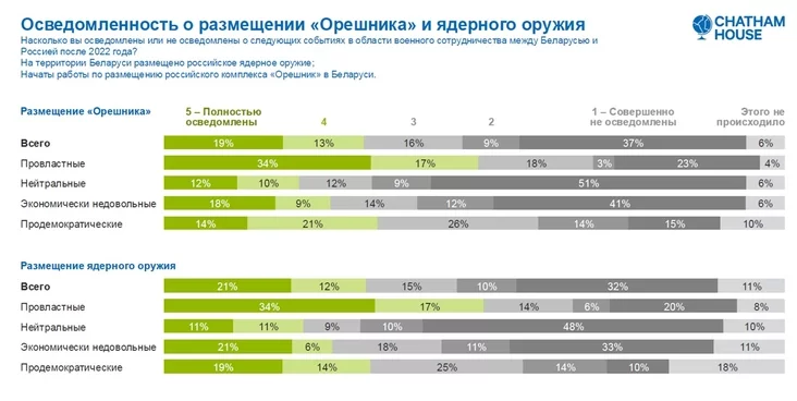 Vyniki apytańnia prademanstravali słabuju daśviedčanaść biełarusaŭ ab detalach vajskovaha supracoŭnictva z Rasijaj. Tak, tolki kala traciny apytanych zajavili, što viedajuć pra płany raźmiaščeńnia kompleksu «Arešnik» i taktyčnaj jadziernaj zbroi (adpaviedna 32% i 33%).