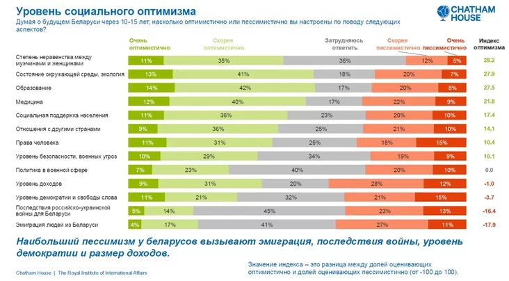 Biełarusy schilnyja piesimistyčna aceńvać nastupstvy rasijska-ŭkrainskaj vajny, a taksama emihracyju nasielnictva. Niašmat aptymizmu vyklikaje i situacyja sa svabodaj słova i ŭzroŭniem dachodaŭ.