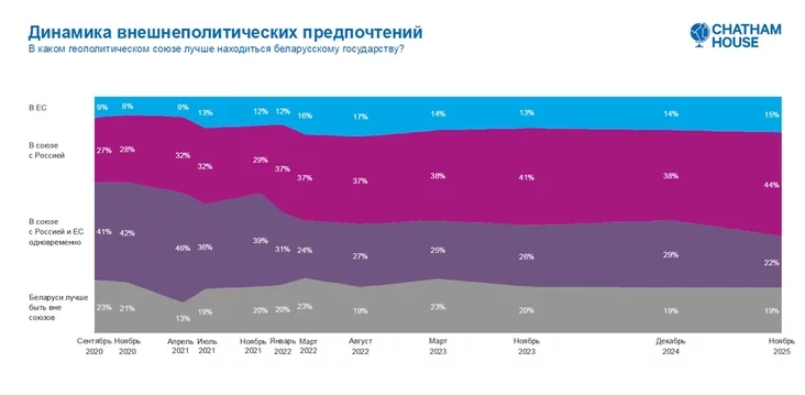 U toj ža čas na praciahu apošnich dvuch hadoŭ amal nie mianiajecca dola tych, chto vystupaje za ŭvachodžańnie krainy ŭ ES (15%), i tych, chto ličyć, što joj lepš zastavacca niejtralnaj (19%). Za adnačasovy sajuz z Rasijaj i ES vykazalisia 22% apytanych.