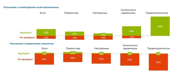 Biełarusy roznych palityčnych pohladaŭ pazityŭna staviacca da vyzvaleńnia palitźniavolenych (tolki 15% vykazvajuć nieadabreńnie). Tady jak da płanaŭ pryciahnuć pracoŭnych mihrantaŭ — pieravažna niehatyŭna.