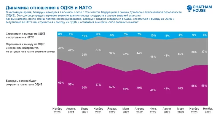Što tyčycca roznych vajennych błokaŭ, to za ŭstupleńnie ŭ NATA paśla źmieny palityčnaha kiraŭnictva ŭ krainie vykazalisia tolki 8% biełarusaŭ. Amal na tym ža ŭzroŭni (37%), što i dva hady tamu, zastałasia kolkaść biełarusaŭ, jakija ličać, što Biełarusi nieabchodna budzie imknucca da niejtralitetu, i tych, chto ličyć, što jana pavinna budzie zastavacca ŭ ADKB (55%).