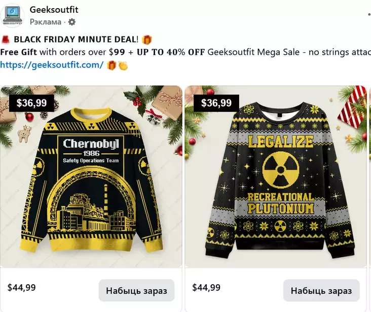 Internet-krama GeeksOutfit vystaviła ŭ prodaž novuju liniejku adzieńnia, pryśviečanuju trahiedyi na Čarnobylskaj AES. Asartymient źjaviŭsia napiaredadni 40‑hodździa katastrofy 1986 hoda i ŭžo vyklikaŭ dyskusii ŭ sacyjalnych sietkach, zaŭvažyŭ «Štodzień».