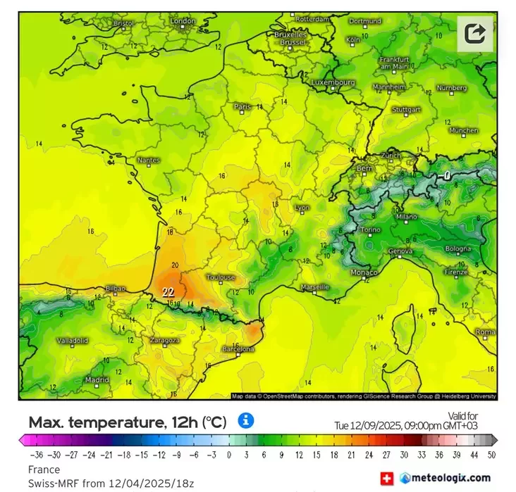 Dzionnyja maksimumy na paŭdniovym zachadzie Francyi mohuć dasiahnuć +22°S, u Hiermanii +17°S, paviedamlaje telehram-kanał «Mieteavajb».