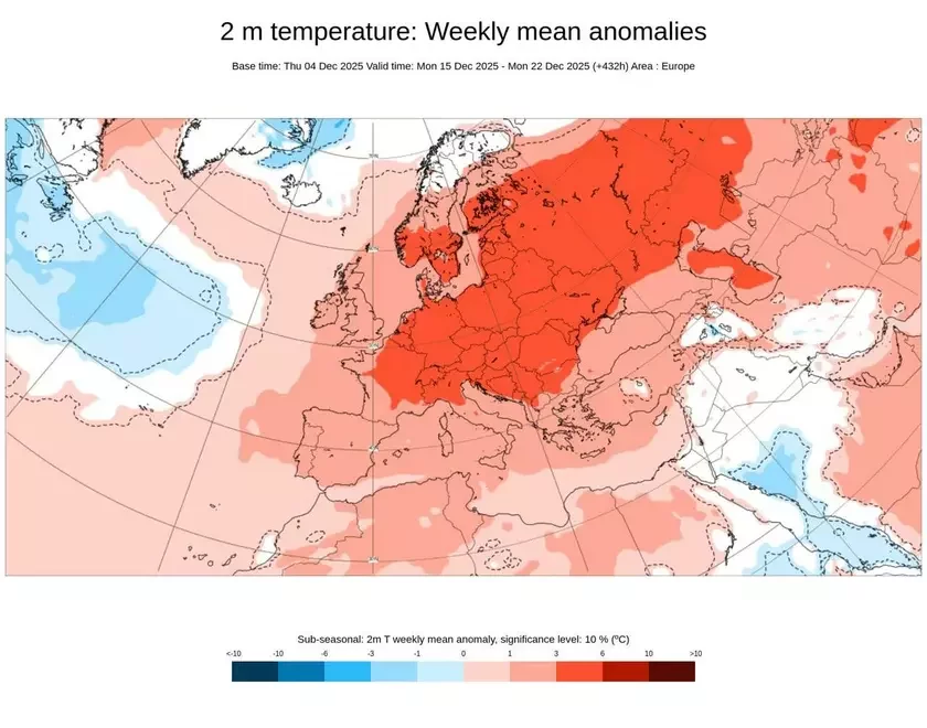 Zhodna z doŭhaterminovym prahnozam madeli ECMWF, paśla niadoŭhaha pachaładańnia 13—14 śniežnia nas znoŭ moža čakać mahutnaja chvala atłantyčnaha ciapła.