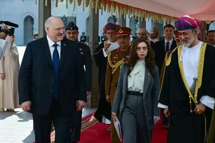 Jaŭhienija Łysienka supravadžaje Alaksandra Łukašenku padčas pieramovaŭ z sułtanam Amana. Maskat, Aman, 15 śniežnia 2024 hoda. Fota: pres-słužba palityka