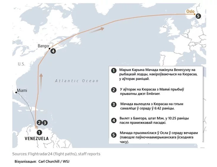 Padrabiaznaści dramatyčnaj evakuacyi lidarki vieniesuelskaj apazicyi Maryi Karyny Mačada raskryvaje vydańnie The Wall Street Journal.