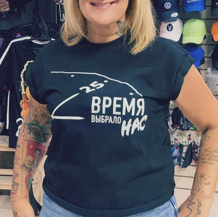 Amal na hrudziach 50‑hadovaj biełaruski zhadany Łukašenka: «A. G. Lukashenko 30.08.1954 r.p. Commander-in-chief armed forces and national president of Republic Belarus» («A. H. Łukašenka, 30.08.1954 h.n. Hałoŭnakamandujučy ŭzbrojenymi siłami i nacyjanalny prezident Respubliki Biełaruś»). Pobač — čyrvona-zialony ściah.