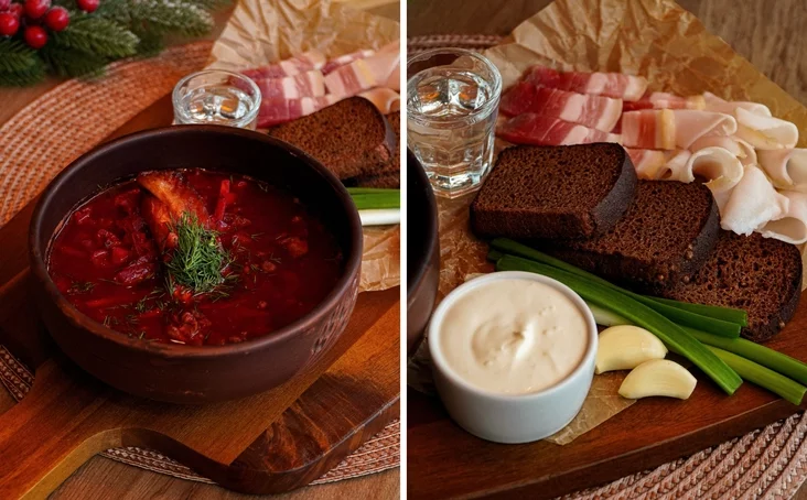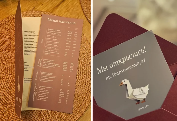 U mieniu restarana prapanujecca sumieś kłasičnych biełaruskich straŭ — takich jak draniki, mačanka i kałduny — i savieckaj dy jeŭrapiejskaj kuchni: aliŭje, sieladziec pad šubaj i zapiečanyja ślimaki.